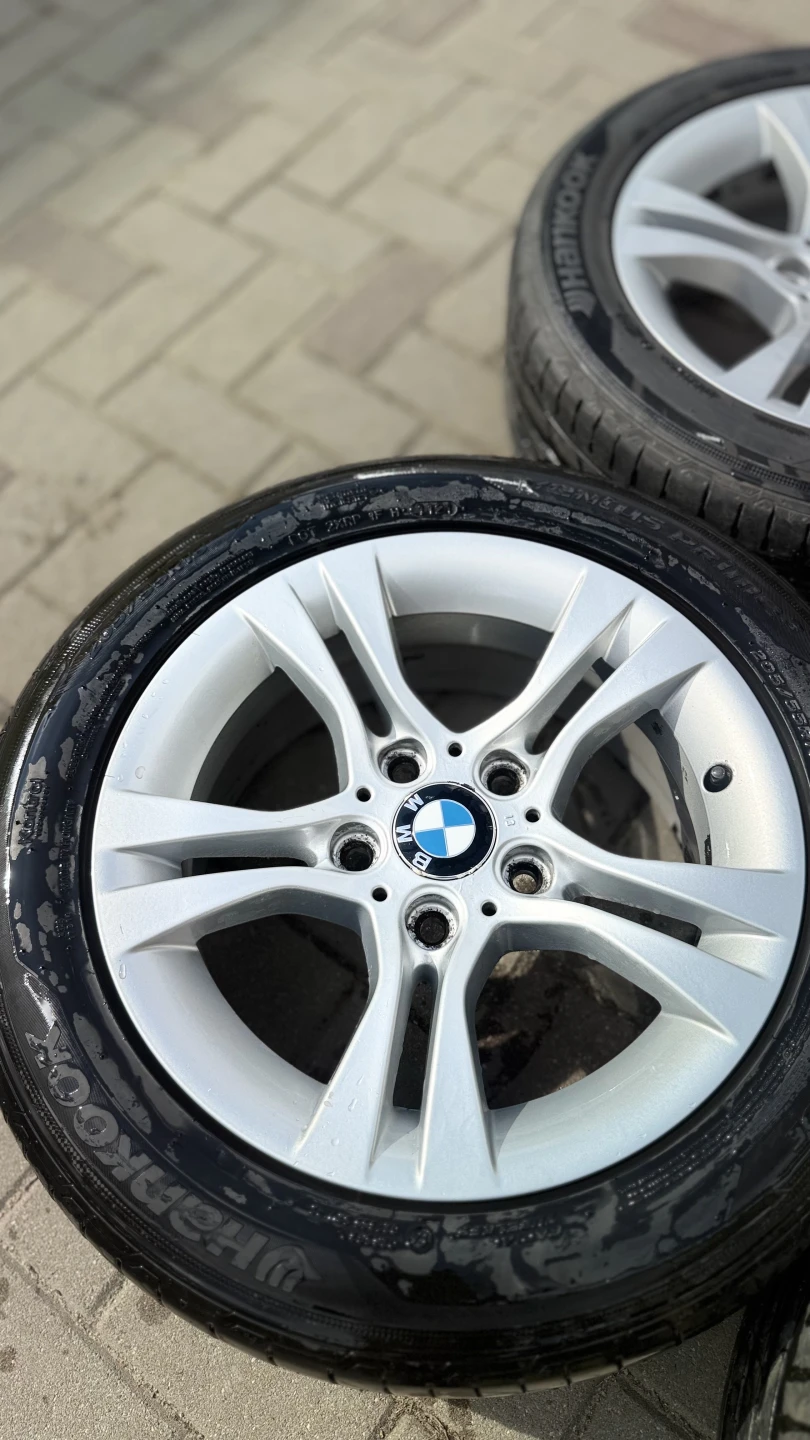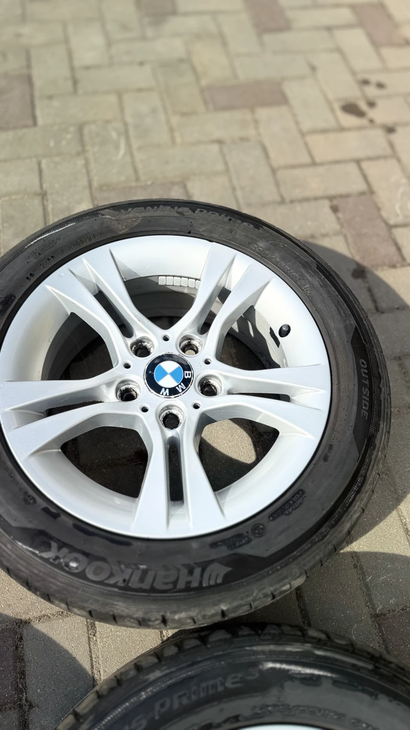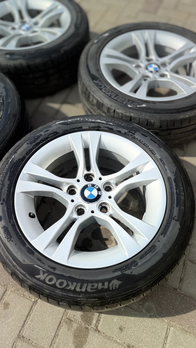 BMW diski ideālā stāvoklī – izmērs 7J, IS31. Diski ir taisni, bez plaisām un metinājumiem, vizuāli ļoti labi saglabājušies. Uzmontētas kvalitatīvas Hankook riepas ar aptuveni 5 mm protektora atlikumu, vēl droši braucamas.