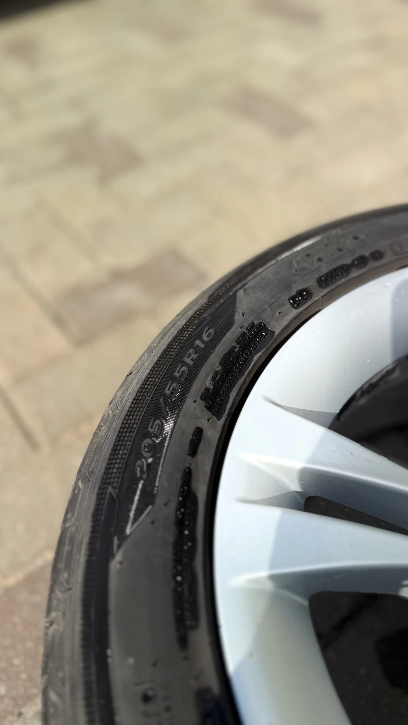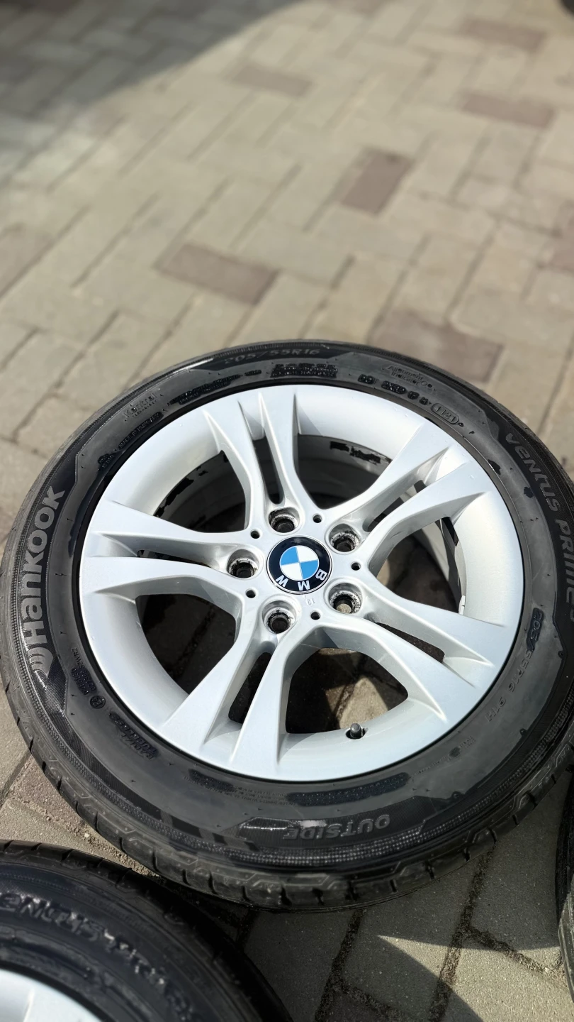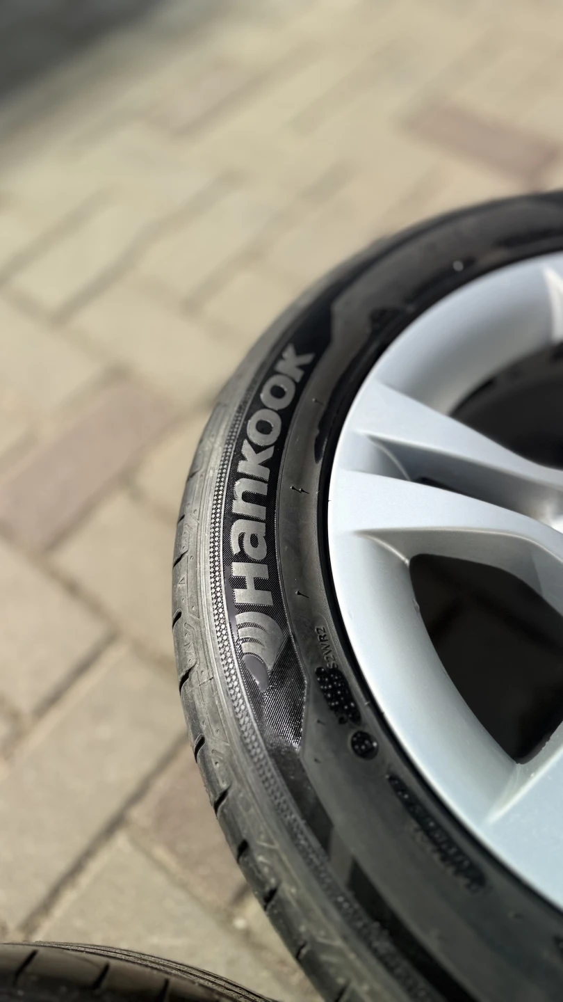 BMW diski ideālā stāvoklī – izmērs 7J, IS31. Diski ir taisni, bez plaisām un metinājumiem, vizuāli ļoti labi saglabājušies. Uzmontētas kvalitatīvas Hankook riepas ar aptuveni 5 mm protektora atlikumu, vēl droši braucamas.